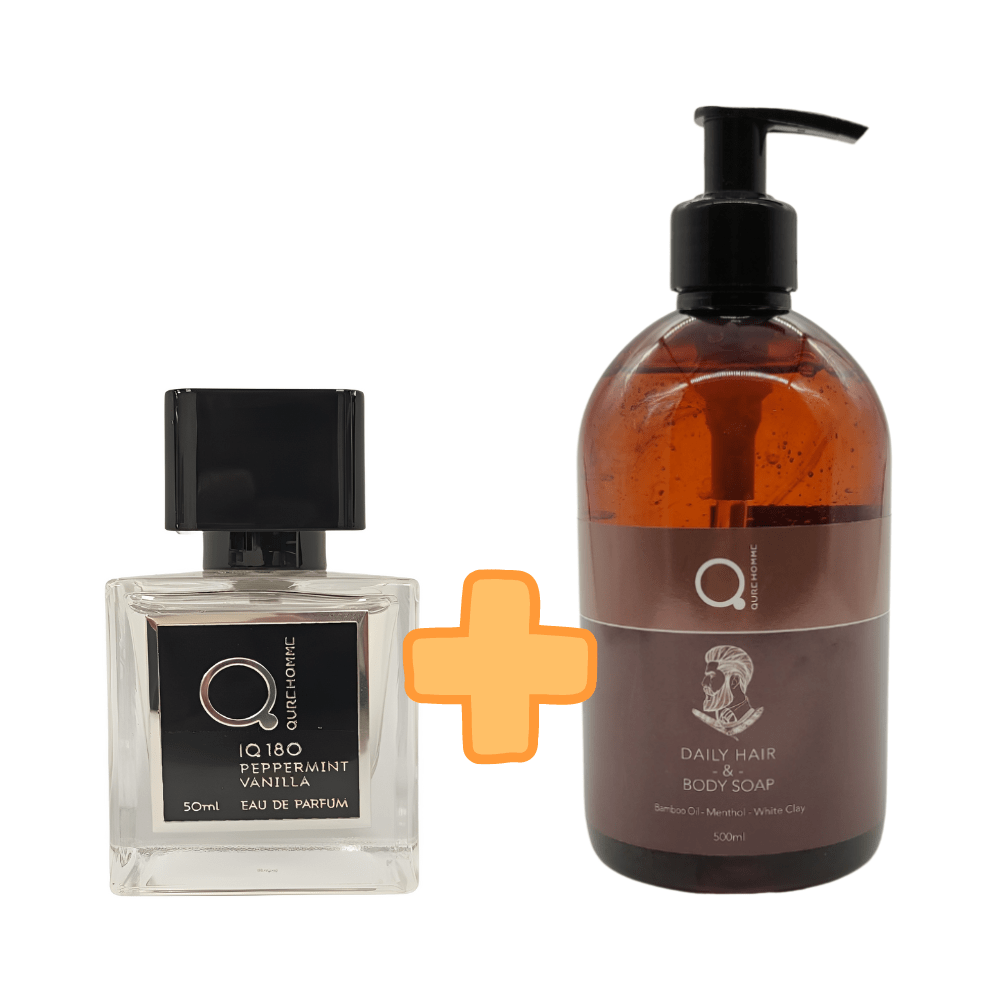 Αναβαθμίστε την εμπειρία περιποίησης με το IQ 180 Peppermint Vanilla Eau De Parfum της Qure Homme και το Daily Hair & Body Soap.